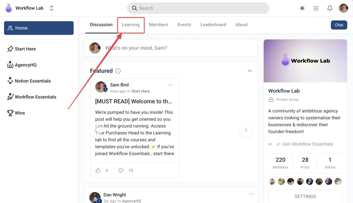Inside the Community: Navigate to the "Learning Tab" to access your templates and courses.